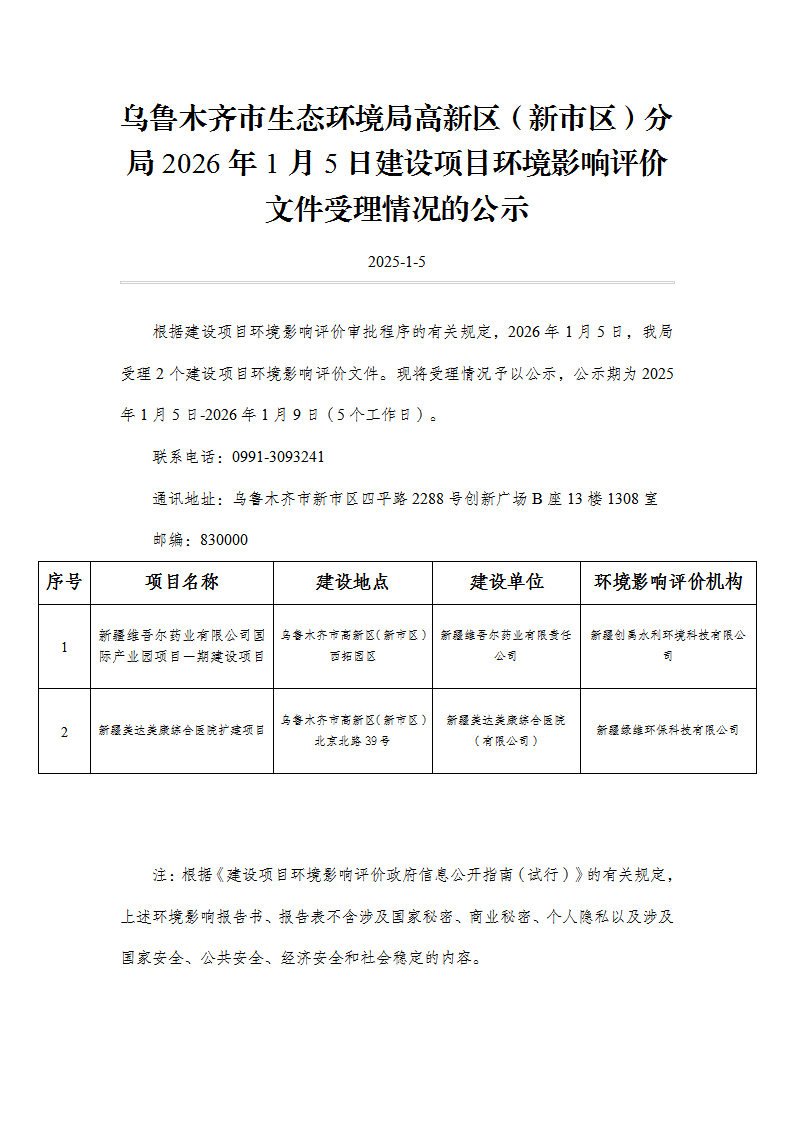 乌鲁木齐市生态环境局高新区(新市区)分局2026年1月5日建设项目环境影响评价文件受理情况的公示 来源:生态环境分局 发布时间:2026-01-05 浏览次数: 次 【字体:小 大】 【打印正文】 分享到: 【字体:小 大】